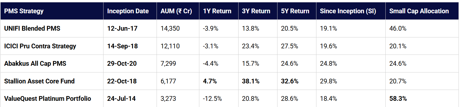 | PMS Strategy | Inception Date | AUM (₹ Cr) | 1Y Return | 3Y Return | 5Y Return | Since Inception (SI) | Small Cap Allocation |